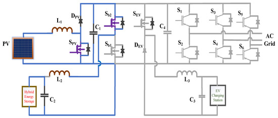 However, a significant number of charging stations that are directly connected to the grid, especially fast and superfast charging stations, put a strain on the stability and dependability of peak demand overload, voltage sag, and power gaps impact the power system. The photovoltaic (PV) generation has been integrated with EV charging infrastructure by few researchers [4]. However, investigations are still considering the PV integration to be a small part of the power supply for EV charging stations. The rapid development of PV generation, with its ample daytime generation, optimizes the power usage at peak times in light of the increased need for speedy charging throughout the day [12,13]. HESS can monitor DC bus or load voltage, balance power gaps, and smooth PV power due to Solar’s intermittent nature.