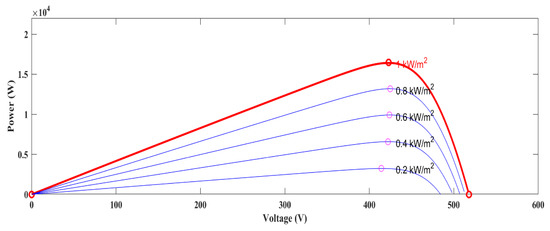 where the current and voltage at maximum power point (MPP) are denoted by IM and VM respectively. P-V and I-V characteristics of the PV panel at a temperature of 25 degrees Celsius and at various irradiances exhibit P-V and I-V characteristics at a constant irradiance of 1000 W/m2 with varying temperatures. The amount of electricity produced by the PV panel is expressed as