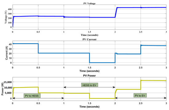 Simulation results are shown as below with respect to different conditions like Mode_1: PV to HESS, Mode_2: HESS to EV; and Mode_3: PV to EV charging station. Figure 19, Figure 20, Figure 21, Figure 22, Figure 23 and Figure 24 represents the PV Voltage, Current and Power at an irradiance of [0.5, 0.8, 1, 0.8, 0.9] ∗ 1000, Across the Hybrid energy storage system, SOC (%) across the battery, EV Terminal Voltage, Current, and Power, two vehicles at a time at an Extreme Fast charging station and Grid DC Voltage respectively.