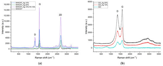 In addition to the peaks belonging to different types of carbon, the appearance of a characteristic blurred peak in the region ~2940 cm−1 can be noticed on the samples of silver-modified catalysts. Unmodified samples of graphene oxide and carbon nanotubes lack this signal. These characteristic signals are especially prominent on the graphene oxide samples: the peak intensity increases with the increasing mass content of silver. This peak can serve as an indirect confirmation of the presence of silver nanoparticles in the synthesized materials—which are characterized by the presence of a group of peaks in the ~2800–3000 cm−1 region [18].
