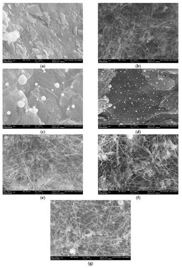 SEM photographs: (a) GO (magnification 5000 times); (b) MWCNT (magnification 5000 times); (c) GO_Ag 10% (magnification 8000 times); (d) GO_Ag 20% (magnification 8000 times); (e) MWCNT_Ag 10% (magnification 8000 times); (f) MWCNT_Ag 20% (magnification 8000 times); (g) MWCNT_Ag 10% Pd 10% (magnification 8000 times).