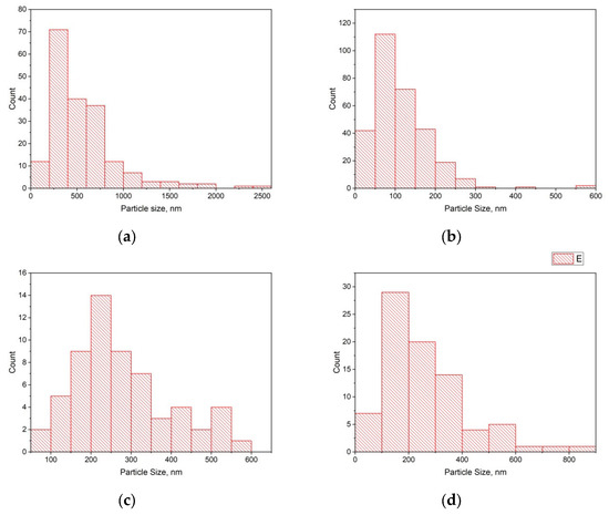 The size distribution of nanoparticles was carried out by post-processing of SEM images. The boundary of contrasting spherical formations was determined and the diameter of the particles within the boundaries of one frame was calculated. When analyzing images from CNTs, it is possible to identify only particles located on the surface of a carbon nanotube. For image post-processing and statistical data processing, ImageJ and Kompas 3D software products were used. The results of the analysis are shown in Figure 4.