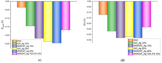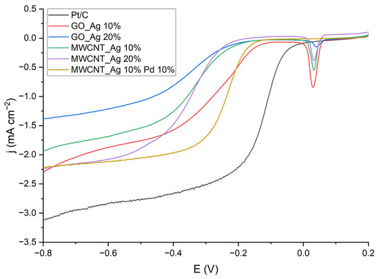 Detailed results of corrosion tests are shown in Table 4. It can be seen that for the samples there is a slight decrease in the initial potential; however, the effect on the half-wave potential is ambiguous. For GO_Ag 10%, the potential increases, and for MWCNT_Ag 10% Pd 10%, there is a decrease.