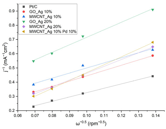 Dependences in coordinates of the Koutecky–Levich equation potential −0.8 V for the synthesized catalysts.