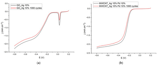 After 1000 cycles in an electrolyte saturated with oxygen, the current density in the diffusion region decreased by a small amount of ~7% for GO_Ag 10% and ~3% for MWCNT_Ag 10% Pd 10%. Thus, the addition of palladium leads to an increase in the stability of the catalyst. This may be due to the fact that probably in the bimetallic catalyst MWCNT_Ag 10% Pd 10% there is a palladium–silver alloy of a certain composition resistant to corrosion. The LV samples are shown in Figure 10.