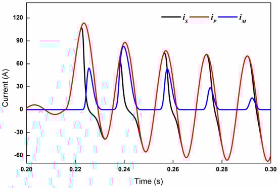 where D denotes the index of saturation information, and is the index of the input signal. The sensitivity of saturation detection heavily relies on , as it particularly means a smaller demonstrates higher sensitivity in the case of heavy saturation. Therefore, the threshold of detection must be carefully selected, as it determines the robustness of the algorithm. Numerical simulation revealed that a suitable threshold is between 0 and 0.22, and 0.16 was adopted to detect CT saturation. The state of detection is 1 when the sum of a normalized magnetizing current in a window exceeds the threshold; otherwise, it is 0.