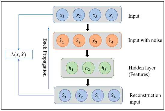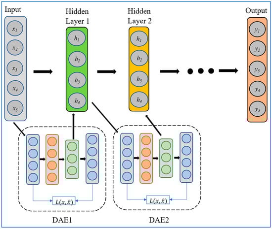 When the original autoencoders contain many hidden layer neurons, they become very time-consuming and converge slowly, although the classification accuracy is improved. The model can learn the repeated representations of the original input data; therefore, Vincent [27] proposed stacked denoising autoencoders (SDAE) to overcome the abovementioned problems. Compared with original autoencoders, the denoising autoencoder (DAE) aims to reconstruct the dataset that is corrupted by noise. Concretely, a DAE consists of an input layer, a hidden layer, and an output layer, which is called a reconstruction layer; the training process ensures that the output vectors correspond well to the input pattern for each unlabeled data x ∈ R. The structure of SDAE is depicted in Figure 2.
