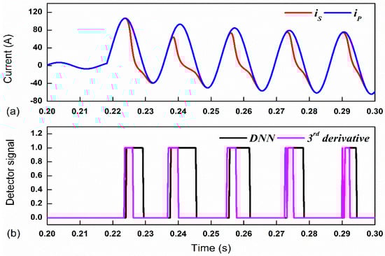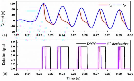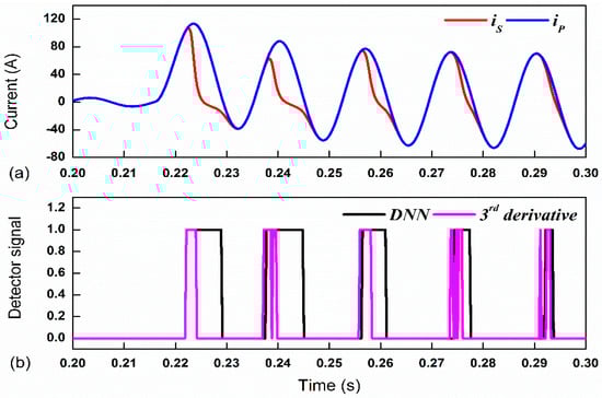 In order to verify the performance of the proposed algorithm for different FIAs, FIA was set to 450 which outputs less severe saturation than the previous case. Results for the FIA of 450 are illustrated in Figure 10; the saturation in each cycle was not as severe as the above case. It is noticeable that the saturation interval was precisely detected with the third derivatives method for each time saturation that occurred. Despite the quick response to the saturation, the endpoints were mis-detected. The output response from the DNN method gives a better estimation of the endpoint saturation that was usable in detecting the saturation interval. The accuracy, CSC, and FSD yielded from DNN were 98.12%, 96.75%, 0.019%, respectively. Therefore, the effect of varying the FIA on the performance of the proposed DNN approach was negligible because the input was normalized to exact similar range. According to the statistics of FSD yield in Table 3 and Table 4, they clearly indicate that the rate of misclassification was greatly reduced.