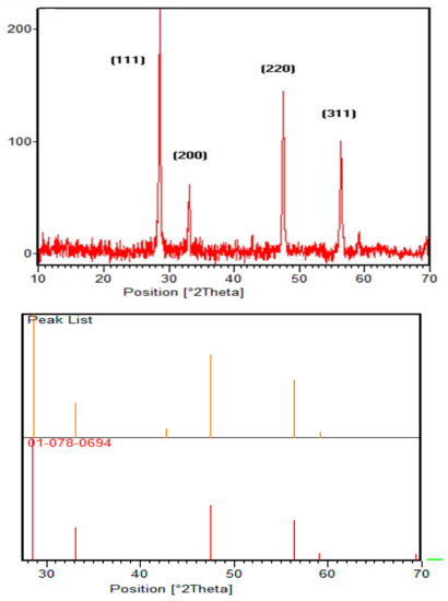 XRD spectrum of TG-CeO2 nanocatalyst (Figure 1) shows that four distinct diffraction peaks appear at 2θ = 28.62°, 33.15°, 47.52°, and 56.36° and can be indexed to (111), (200), (220), and (311) lattice planes of cube. The attained sharp peaks at 28.62°, 47.52°, and 56.36° corresponded to d-values of 3.11 Å, 1.91 Å, and 1.63 Å, respectively, revealed by Joint Committee on Powder Diffraction Standards (JCPDS No. 01-078-0694). The lack of additional impurity-related peaks in the XRD spectra suggests that the wet impregnation approach is used to create a pure TG-CeO2 nanocatalyst. The diffraction peak intensity corresponds to the (111) plane 100% and is the preferred orientation plane for the CeO2 crystal lattice. The average crystallite diameter of a more intensified peak (111) was computed via Debye Scherrer Equation (6) [27].