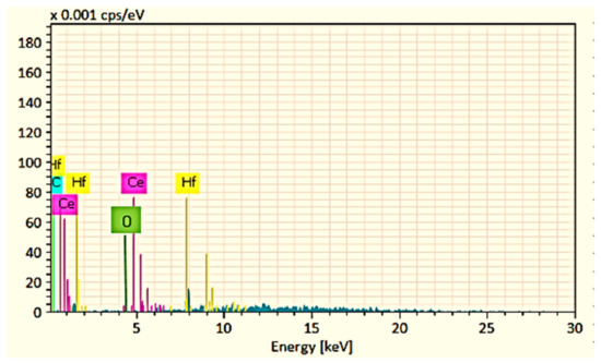 The EDX spectrum of the CeO2 nanocatalyst is shown in Figure 3. The sharp peaks appear at 0.3 KeV, and 6.8 KeV confirms the presence of cerium (Ce); carbon (C) and Oxygen (O) elements were observed at 0.2 KeV and 0.6 KeV, respectively. Additionally, the carbon peak confirmed the presence of organic compound in TG [31]. The presence of oxygen is attributed due to CeO2. The elemental composition of synthesized novel CeO2-TG nanocatalyst is asC = 35.73%, O = 61.33%, and Ce = 2.94%. The EDX spectrum results show the purity of the created green nano-catalyst, which is recommended for the biodiesel production [31] and synthesized Pd nanocatalyst via green synthesis. The plant gum was used as a stabilizing agent. The results of EDX analysis confirmed the presence of Pd with other organic compounds. Akhtar et al. [13] analyzed the elemental composition of TG-modified NiSO4 nanocatalyst. Carbon (C) peak was observed in the quantitative elemental analysis of the nano-catalyst synthesized, which is most likely due to the active ingredients in TG exudates used in the production and capping of the NPs. The current study’s findings are comparable to those found in the literature.
