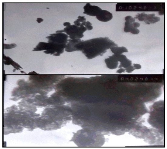 The internal morphometry of synthesized TG-CeO2 nanocatalyst is studied via TEM analysis (Figure 4) based on the electron transition from an image on a phosphorescent sheet. Light and dark areas in the image are associated with high density with less electron transition and low density with high electron transition, respectively [32]. The mean size of the particle nanocatalyst observed from the TEM image was 22 nm which matches the value reported by XRD analysis. The agglomeration of impregnated CeO2 was observed on the TG support in different orders. The TG-CeO2 nanoparticles exhibit a highly porous structure with a hexagonal shape and cylindrical walls. A porous structure with a large surface area can be assisted with a good stand for triglycerides molecule present in D. sophia oil to react with alcohol and produce biofuel [33] synthesized and characterized Ag nanoparticles from Annona muricata leaf extract. The findings showed spherical, mono-dispersed silver NPs with a mean particle of 22–28 nm. Sethy et al. [34] synthesized and characterized TiO2 nanoparticles from Syzygium cumini via the green route. Results revealed that the crystal size matched the size determined via Debyee Scherrer’s equation in XRD analysis.