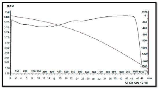 The effect of high temperature on the thermal stability of synthesized novel CeO2-TG nano-catalyst was further analyzed via Thermogravimetric analysis (TGA). Figure 5 represents the TGA/DTA (Differential Thermal Analysis) curves of the CeO2-TG nanocatalyst at two weight loss events. The curves were obtained in the nitrogen atmosphere at the intermediate rate of 10 °C/min. The thermal decomposition occurred from 400–450 °C with 3.8% weight loss due to water molecule (water of crystalization CeO2·H2O) evaporation. However, the thermal stability of the catalyst remained high up to 600 °C. After that, a minor weight loss confirmed moisture content elimination with organic residuals. It also proves the formation of support. Finally, significant weight loss occurs from 850–1050 °C due to the decomposition of the Cerium oxide (CeO2) structure [35].