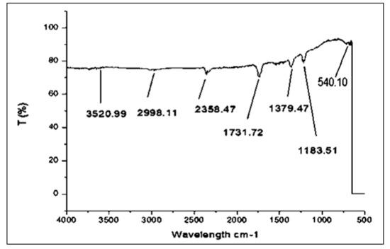The functional clusters present in the synthesized TG-CeO2 nanocatalyst were analyzed via FT-IR spectra (Figure 6). The band appears at 540 cm−1 showing the stretch vibration due to the Ce-O group. The stretching of the C–O bond was observed at 1183.51 cm−1. A sharp, intense peak at 1379.47 cm−1 was allocated to the deformation of the C–H bond. The characteristic asymmetric stretching vibration of –COO− was observed at 1731.72 cm−1, whereas the peak appeared at 2998.11 cm−1 and was ascribed to the stretching vibration of the aliphatic -CH3 group present in TG. The strong peak at 3520 cm−1 corresponds to water-molecule stretching. Akhtar et al. [23] analyzed the efficiency of CuO-CeO2 nanocatalyst for biofuel generation from Sterculia feotida seed oil. The characteristics peaks appeared at 681 and 690 cm−1 revealing Cu-O particles. However, the peak visualized at 668 cm−1 confirms the presence of CeO2. The stretching of the O–H molecule was observed at 3648 cm−1 and 3565 cm−1. The FT-IR results of the current study are comparable to that of the previous research.