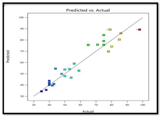 Predicted vs. actual biodiesel yield values are found adjacent to the straight line representing a good relationship between predicted and actual values (Figure 7). A high F-value (10.45) and a low p-value (<0.0001) is highly significant and also indicate the substantial effect of variables on the process yield [36]. The fact that the p-value for lack of fit (0.70) was greater than 0.05 indicates that the model is appropriate for the experimental data. The adequate precision value (8.854) is greater than the minimum desired value of 4 [37], which shows the model’s accuracy. R2 = 0.90 showed that the approved polynomial equation determines more than 90% biodiesel production. Additionally, the adjusted R2 = 0.8203 and predicted R2 = 0.6239 have a slight difference of less than 0.2, confirming that the selected model is appropriate for examining the relationship among variables. The quadratic terms of the transesterification reaction, namely reaction temperature (B2) and reaction time (D2), have p-values of 0.05, indicating that they are significant, whereas catalyst concentration (A2) and methanol-to-oil molar ratio (C2) have p-values of >0.05, indicating that they are insignificant.