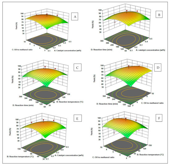 The 3D plots (A–F) present the impact of different optimization parameters on D. sophia biodiesel yield.