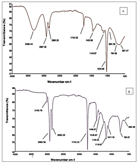 It is an efficient analytical technique that uses fingerprinting to identify the chemical bonds and functional groups in oil and biodiesel [47]. FTIR spectrum of D. sophia seed oil and D. sophia biodiesel product have similar chemical structures. However, they have small differences in intensities and frequencies of the absorption band [48]. In (Figure 9A), the broader peaks were observed at ~3465.44–2890.26 cm−1 in oil spectra, while biodiesel spectra (Figure 9B) showed strong stretching of the C-H methoxy group. Additionally, D. sophia seed oil has only a single peak at 1450.68 cm−1 attributed to asymmetric (C-H) deformation, while in D. sophia biodiesel spectra (Figure 9B), peaks were observed at 1456.67 cm−1 and 1436.87 cm−1 representing asymmetric bending of CH2 and asymmetric stretching of CH3, respectively. An observable characteristic peak in both spectra of oil and biodiesel at 1742.02 cm−1 is attributed to a carbonyl group (C=O) stretching, which confirms the presence of an ester compound. In the IR spectrum of Brassica juncea biodiesel, the peak of the carbonyl group was observed at 1744 cm−1 [13]. However, it was discovered at 1740 cm−1 in the biodiesel from Celastrus paniculatus [49]. These results are in line with the present study. The fingerprint region from 1500–900 cm−1 illustrates the difference between the oil and biodiesel spectrum. A strong peak observed at 1145.87 cm−1 (Figure 9A) fragmented into two peaks, i.e., 1130.32 cm−1 and 1118.67 cm−1. A peak at 964.35 cm−1 relates to CH2 wagging for oil absent in biodiesel. Strong stretching of the alkane group appeared at 580.56 cm−1 [50]. FTIR results showed that D. sophia seed oil was effectively converted into D. sophia biodiesel.