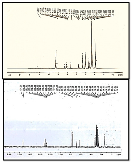 D. sophia biodiesel was further analyzed via NMR (1H and 13C). The molecular makeup of biodiesel was ascertained using the 1H NMR method, which was also used to confirm that methyl ester was synthesized during the transesterification reaction. Figure 11 (upper) illustrates the 1H NMR spectrum of biodiesel and its respective signals. The signals appeared at 0.88 ppm, attributed to terminal methyl protons (C-CH3) at 1.23–1.67 ppm, and at 2.01 ppm, they were attributed to methylene group (α- CH2, β-CH2), which denoted the presence of hydrogen atoms on the third carbon in an aliphatic fatty chain. The peak at 0.87 ppm corresponded to the terminal methyl protons, while the peak for olefinic hydrogen (-CH=CH-) displayed the double bond integrated for two hydrogen atoms for each double bond group, which was seen at 5.32 ppm. Allylic hydrogen (-CH2), which has two hydrogen atoms per non-conjugated group in the spectrum, exhibits a peak at 2.76 ppm. The appearance of a characteristic single peak at 3.5 ppm attributed to methoxy protons (-OCH3) confirms the synthesis of methyl esters. The 13C NMR spectra (Figure 11 (lower)) indicate characteristic signals at 30.11 ppm, and 174.21 ppm corresponds to (-CH2) n and (-COO-), respectively. The unsaturated position in a DSBD (CH=CH) methyl ester was observed at 127.8 ppm for inner non-conjugated carbon. The chemical shifts observed at δ (ppm): 29.35 (-CH2-)n, 77.5 (-C-O), 129.8 (-CH=CH-); outer non-conjugated carbon was observed in the biodiesel spectrum [13]. All these peaks are similar to earlier described work [52,53]. The total conversion of D. sophia oil into biodiesel was 99% by employing the formula given by [43], which is very close to the practically obtained biodiesel yield (98%).