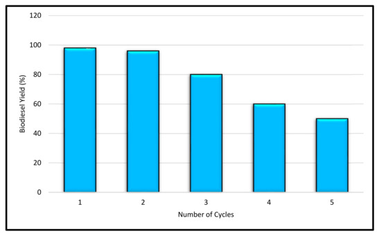Reusability is one of the most important factors to consider when evaluating catalyst performance. The catalyst’s durability and practicality for producing biodiesel on an industrial scale depend on its capacity for recycling in a reaction process. The nature and kind of the catalyst and the purification, separation, and transesterification procedure impact the reusability of the nanocatalysts [56]. The nanocatalyst can be easily detached from the product and recycled at the end of the reaction in the present study. The reusability of TG-CeO2 was studied at optimized reaction conditions, i.e., the molar ratio of oil to methanol (1:8) and catalyst concentration (0.3 wt%) at 90 °C for 210 min. After each reaction round, the used catalyst was washed multiple times with CH3OH, oven-dried at 60 °C for 4 h, and reused in the next reaction. The reused catalyst showed a drop in performance in the second round (2%) and the third round (8%) (Figure 12). The best catalyst can provide biodiesel yield (80%) through the third round, according to the results of the catalyst reusability test. However, in the fourth round, there was a decline in catalytic activity as a result of the catalyst’s basicity, small surface area, leaching from organic species, such as glycerol, and deactivation of the active sites on the catalyst [60].