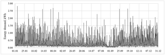Hourly demand for electricity in building 8–house without electric heating. Source: compiled on the basis of data obtained from the DNO operator. Anonymous data.