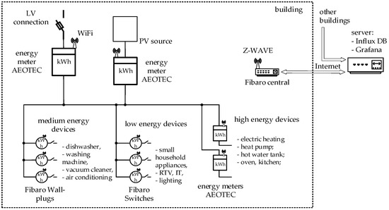 Profiles obtained from DNO operators are characterized by data continuity, but their main limitation is the reading frequency, which is 15 min. The limitation is the inability to observe changes in the values of active power. Therefore, an alternative way to obtain measurement data (as part of one of the research projects) was to install our own measurement systems with full access to the measurement data. The Fibaro measurement and control system was selected [43,44]. This system enables monitoring and recording of electricity flow for the entire building and selected devices and photovoltaic source. Fibaro Wall-plug and Fibaro wall-switch measurement systems and AEOTEC meters communicated with the Fibaro control panel via the Z-wave interface [45,46]. The measurement system is shown in Figure 3. It should be noted that the Fibaro measurement systems were installed in other buildings than those described in Section 3.1.1.