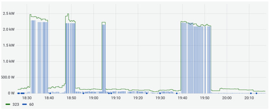 Comparison of registered dishwasher active power waveforms: 323–data logged with an AEOTEC meter (active power consumed by the whole building); 60–data logged using Fibaro wall-plug. Source: author’s development.