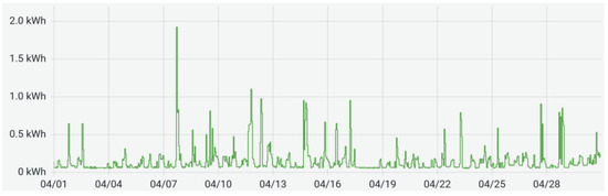The measured values of active power and energy were saved in the Influx DB database and supported by the Grafana application [47,48,49]. The Grafana system makes it possible to standardize recorded electricity waveforms to 15 min, 60 min and 24 h values [50]. In principle, the Grafana system made it possible to adjust the recorded electricity data to any chosen sampling period. Figure 5 shows an example graph of the Grafana application of 60 min energy waveform for a selected building, a flat used by 2 persons. Energy meters record and send to the database the increasing value of the counter. To obtain values, e.g., 60 min, it was necessary to use the differential recording function.