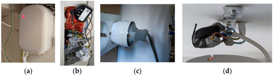 Photographs of sample installed measurement systems: (a) AEOTEC meter installed in the building’s switchboard; (b) Fibaro switch in flush-mounted socket; (c) Fibaro wall-plug; (d) Fibaro switch in the housing of the ceiling lamp. Source: author’s development.