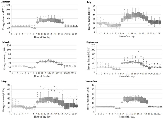 Building load profiles 1–10 were used as input for statistical analysis. Due to the need to compare buildings of different character, it was assumed that the statistical analysis would use data only for working days (without Saturdays, Sundays and holidays). Tukey’s box plot [54] was used to visualize the statistical analysis, which allows for a detailed presentation of statistical data.