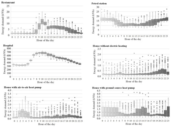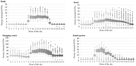 Box plot of data for selected characteristic buildings each hour on a business day in 2017. Source: built on the basis of author’s calculations and data from DNO operator.