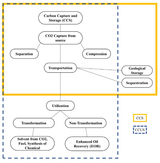 LCA is a process for evaluating possible benefits as well as different environmental consequences through a product’s or service’s life cycle. The LCA is based on the defined approaches of ISO 14044 [11] and ISO 14040 [12]. The standard LCA analysis is based on choosing the functional unit, background processes, system boundaries, or environmental impact assessment. During the Life Cycle Impact Assessment (LCIA) stage, a specific set of methods and models is used to estimate the environmental impacts based on flows into and out of the environment from the Life Cycle Inventory (LCI). Typically, these methods characterize and classify emissions, using impact-related reference indicators. Thus, the environmental effects of a projected system can better comprehend at an early stage by quantifying the possible environmental implications. The life cycle assessment method evaluates the environmental impacts of a CCS or CCUS plant throughout its life cycle, in different stages (extraction, production, transportation, processing, and storage), in addition to recycling and final disposal of waste materials [13]. A clear distinction should be made between carbon capture and utilization chain utility (CCU) and storage technologies (CCS), as shown in Figure 1. When evaluating the environmental performance of power plants using CCS, it is implied that upstream (e.g., extraction of fuel, transportation) and downstream activities (e.g., CO2 transport, injection, and storage) must be involved in the CCS chain designs [14].