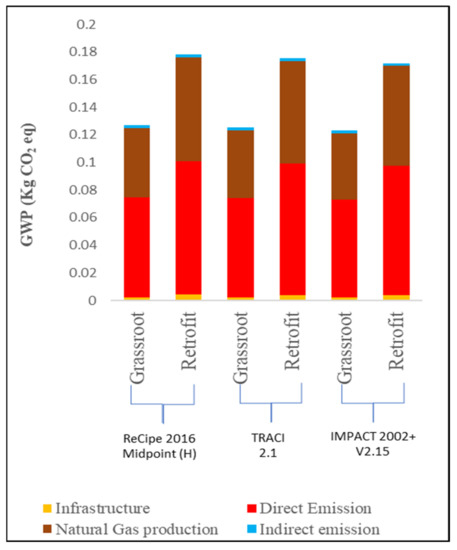 As can be shown in Figure 6, outcomes for the grassroots scenario demonstrate a considerable decrease in GWP. Generally, in the case of the grassroots design, the proposed NGCC-CCS would emit 0.123–0.127 Kg CO2 eq, while 0.172–0.178 Kg CO2 eq would be emitted in the retrofit design, when producing 1 kWh of electricity based on different impact assessment methods. This is 76% lower than base-case NGCC without a capture system, as reported by [45]. The capture plan is assumed to capture 90% of CO2 in the flue gas for both cases. In order to integrate a CO2 capture process into an existing power plant, measures must be taken to guarantee a sufficient steam supply for solvent regeneration. It is evident that CO2 capture is an energy-intensive process as the heat required for solvent regeneration in the retrofit scenario has the most significant influence on the total process power output. Compared with the grassroots scenario, in the retrofit scenario the natural gas required to generate steam for the regeneration column in the capture unit cannot be supplied internally, which is basically due to the limited existing capacity of the power plant. Thus, the GWP score for natural gas production is higher for the retrofit scenario in all methods.