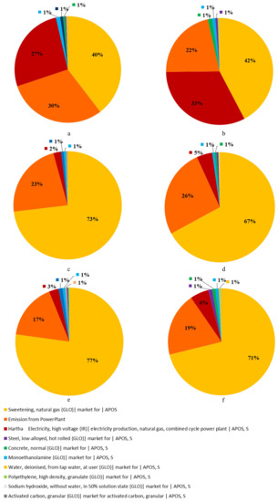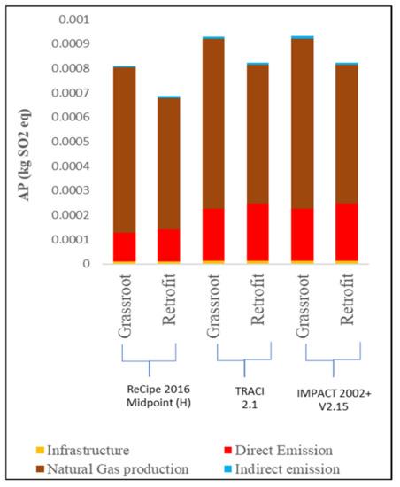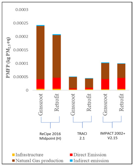 According to Figure 8, direct emissions from the plant facility are responsible for 17–19% of the overall PMFP impact for both scenarios, with NOx emissions from fuel combustion accounting for the majority of around 77%. Infrastructure demand accounts for 6% of the impact. As can be seen from the results of the three methods, the ReCipe 2016 Midpoint (H) has the higher impact scores, compared with the IMPACT 2002+ method and the TRACI method for both scenarios considered, with a higher impact on the retrofit scenario. The power plant in the grassroots scenario appears to emit more PM2.5 into the atmosphere than in the retrofit scenario. In TRACI 2.1, the reference element, PM2.5, was used to classify the elements [77]. However, the IMPACT 2002+ is based on a thorough review of CFs and intake fractions, primary PM, and secondary PM from SO2, NOx, and NH3 between 2008 and 2010, resulting in updated intake factors for respiratory inorganics [77,78]. Value choices in modeling the effect of fine particulate matter formation in Hierarchist ReCipe 2016 Midpoint are the primary and secondary aerosols from SO2 [47]. The evaluation of the environmental contribution reveals that natural gas production accounts for 40% of the total GWP score in the grassroots case, followed by direct emission (30%) and the operational energy requirements (27%), as represented in Figure 9a, while these shares are 42%, 33%, and 22%, respectively, for the retrofit scenario (Figure 9b). For the AP score, 73% of the environmental contribution comes from natural gas production, 23% from direct emission, and 2% from the energy consumption for capturing in the grassroots scenario (Figure 9c), while contributing 67%, 26%, and 5%, respectively, for the retrofit scenario as shown in Figure 9d. Figure 9e,f show the share of PMFP, indicating more than 70% of environmental contribution by the natural gas production for both scenarios; however, the share of the direct emission is estimated at 17% and 19% in the grassroots scenario and retrofit scenario, respectively.
