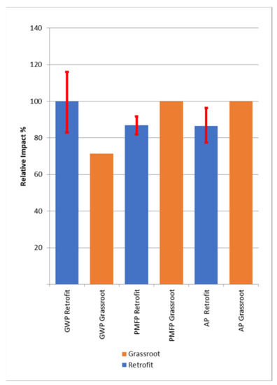 The SimaPro 9.1.0.11 software was used to perform the LCA in this study. The impact scores are calculated for the three environmental impacts under study, which are: the global warming potential (GWP), particulate matter formation potential (PMFP), and acidification potential (AP), using three different life cycle impact assessment (LCIA) methods shown in Table 6. Regionalized characterization factors (CFs) of air pollution developed by [61] were used for the impact assessment stage of an environmental life cycle assessment as in Equation (3). In order to derive the regionally-specific damage factors and effects, background concentrations, mortality rates, and years of life lost data have been used [61]. The recommended average breathing rate (BR) of 13 m3/d has been used based on [73]. Population data were collected from [74]. The two examined scenarios of grassroots and retrofit design and their contributions to the selected category with an expansion on the modeling findings, similarities from the literature with sensitivity analysis are analyzed as shown in Table 6.