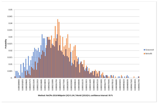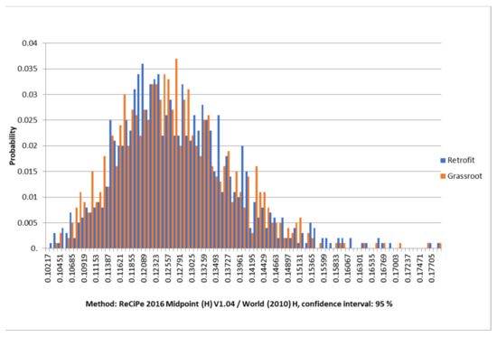 The key negative impact was presented in a small CV by GWP of (CV = 9.32%) for the retrofit scenario and (CV = 8.34%) for the grassroots scenario (see Table 10). Categories with a low impact yet a high CV value on both scenarios were caused by the uncertainty in the database used and materials by acting mainly on PMFP and AP with more effect on the grassroots scenario, as this scenario requires more assumptions to develop. The graphical representations of the probability distribution of the three environmental impacts for both scenarios are shown in Figure 11, Figure 12 and Figure 13. The result of AP impact has the highest probability index, while the results of the GWP show a minor index with a lognormal distribution for both. It is noteworthy to highlight the divergence in the sensitivity curve for the AP impact score in the two scenarios (retrofit CV = 15%, grassroots CV = 15.9%). Uncertainty in AP is due to the uncertainty in releasing NOx emissions data [83]. The uncertainty of the related activities of the grassroots scenario that emits SO2 and NO2 as direct emissions are significantly reduced throughout adding the capture process; however, this reduction is insufficient to offset the effect in the retrofit scenario. PMFP probability index score results indicate that the retrofit case has a higher score than the grassroots case (CV = 15.2%, CV = 16.8%).