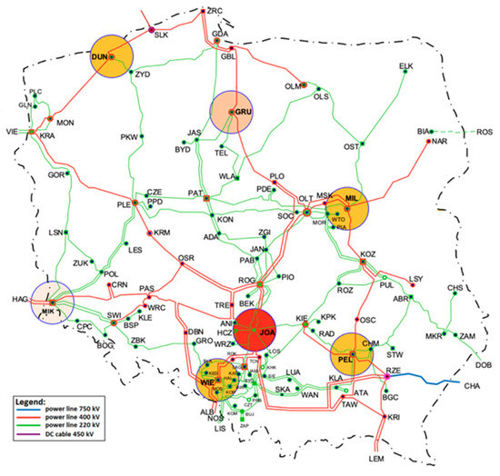 The increasing number of renewable sources (RESs) [1,2,3,4,5] that depend on the weather conditions inside an NPS change the power balance structure and affect the geographical distribution of generation sources. In the case of Poland, most conventional generation sources are located in central or southern Poland. Such a system forces power flows from the south to the north of the country. The development of RESs changes the directions of power flow. On days with high RES generation, the transmission network operates in unfavorable conditions with a small safety margin. Moreover, on days with a large gradient of wind generation changes, the directions of power flow in the PS change in a way that is difficult to predict. This has a negative impact on compliance with the basic criterion of occupational safety of PSs, the so-called N-1 criterion [6,7,8]. This criterion ensures such a safety margin that in the event of switching off any of the PPS components (a line, transformer, busbar section, or generator, etc.), the remaining elements in operation can take the load of the switched-off element without violating technical limitations. Otherwise, cascading shutdowns of successive NPS elements may occur, leading in extreme cases to a catastrophic failure (blackout).
