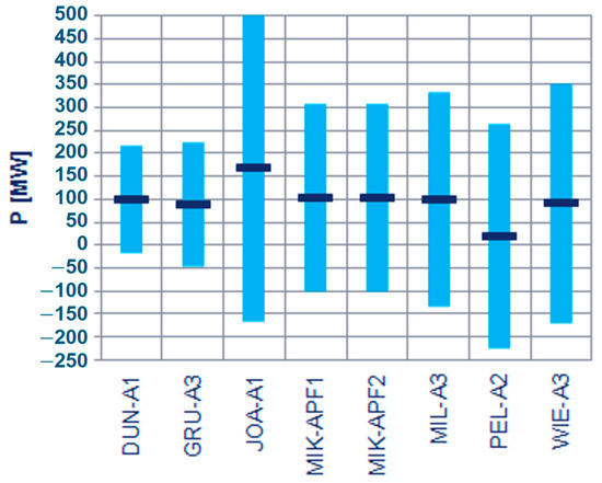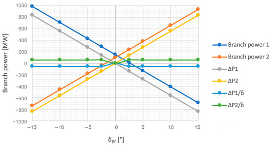 The use of this type of transformer unit allows for the availability of active power regulation in a wide range. By investigating their possibilities of use, the range of changes in power flows obtained by these transformers was obtained, with the results being shown in Figure 2.