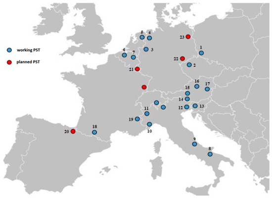 Loop flows and transit flows cause significant problems and not only within national networks. The operational capacity of the cross-border exchange line is deteriorating due to a significant reduction in (or the exhaustion of its) transmission capacity. Market transmission capacities are deteriorating, but emergency imports and exports of energy are also becoming impossible. To improve this situation, phase shifters with OLTC regulations are used on an increasing scale in the UCTE region (Figure 3). The use of this type of equipment is considered the preferred cost-free remedy (it does not change the cost of generation). Using only countermeasures, such as using a DC loop or redispatching, will not solve the problem. Figure 3 shows the location of the current (black) and future (red) PST installations in international strings.