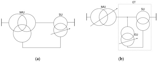 Figure 5 shows exemplary schematic diagrams of regulating transformers (RT) enabling voltage magnitude and phase angle regulation. These transformers are most often made in the form of transformer units consisting of a main unit (MU) and a phase-shifting unit (PST). The main unit is a transformer (or auto-transformer) that interfaces networks with different voltage ratings. The extension transformer (ET), depending on the version, may consist of one or two transformers: a series transformer (SU) and an exciting transformer (EU).