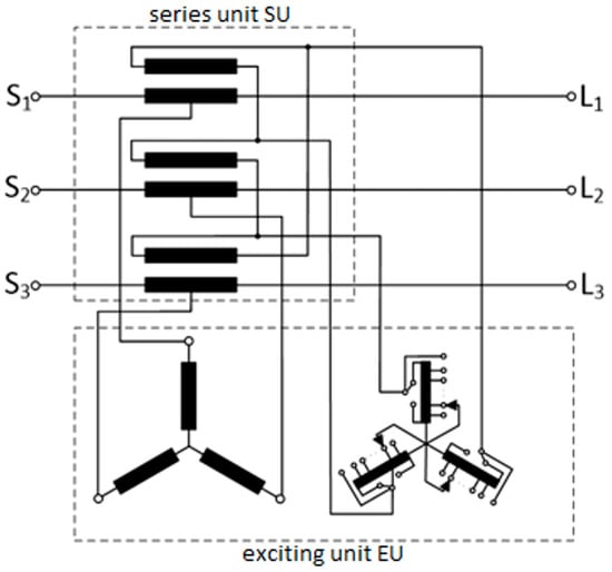 The series unit is mainly responsible for adjusting the phase shift angle between the voltages at both ends of the entire assembly. The windings of the individual phases of the series unit (SU) on the high voltage side are neither star-connected nor delta-connected. They are included in the transmission system in series (hence the term series transformer). The low voltage windings can be supplied with phase or phase-to-phase voltages from the exciting unit or directly from the third main unit winding. The role of the exciting unit is to provide the series unit with a voltage of appropriate magnitude, a phase angle, and a phase sequence. The role of the exciting unit can also be played by the third winding of the main unit (Figure 5a). However, equipping the adding unit with an exciting unit (Figure 5b) is operationally more convenient. For example, in the event of a faulty tap-changer or phase-shifting transformer, SU and EU units can be by-passed. This will enable the operation of the transformer unit, then composed only of the main unit, so that damaged devices can be repaired without the long-term downtime of the entire unit. An example of a three-phase connection diagram of an exciting unit and a series unit is shown in Figure 6.