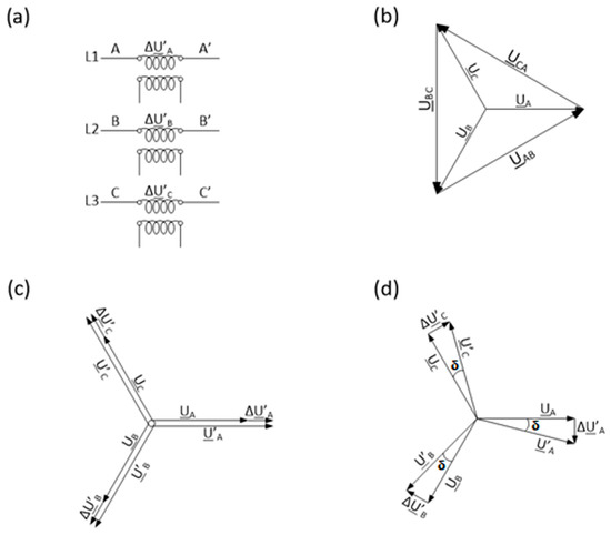The idea of regulating transformer regulation: (a) series transformer winding; (b) phase voltages and phase-to-phase voltages supplying the series unit; (c,d) phase voltages at the output of the series unit (Figure (c)—for voltage-magnitude regulation; Figure (d)—for phase-angle regulation).