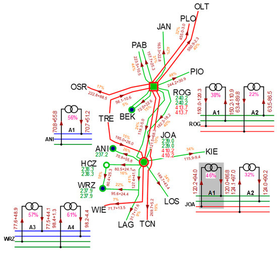The work of transformer units was analyzed in a meshed system of 400 kV and 220 kV of the Polish national power system model. The network system was analyzed, as were the structure and set of the network elements which reflect the current state of the NPS at the winter peak load. The reference system was the base system without complex regulation, hereinafter referred to as the base scenario S0. The calculations focused on determining the value of active power flows on the NPS elements. Figure 8 shows the power flows in the direct network environment of the substation with an installed transformer set with a regulation (the transformer is highlighted with a gray background). The transformer A1, installed in the Joachimów bus, was selected in the analysis.