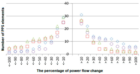 Figure 10 shows the dependence of the number of network elements affected by the change in operating conditions (expressed in the level of power flow) as a result of a change in the scenario of setting the regulating parameters of the considered transformer unit with complex regulation as well as the range of the flow change. Only elements for which the change in flow exceeded 10% were taken into account in the chart.