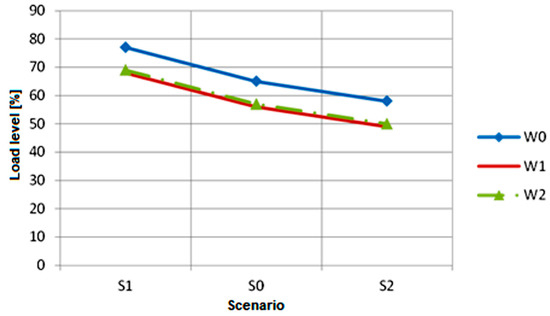 Changes in the load level on the 220 kV line on the Joachimów–Rogowiec relation for various variants of the PPS operation and scenarios for the transformer control settings.