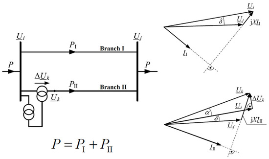 Equation (1) shows that the active power flowing in the transmission line can be changed by changing the nodal voltages Ui and Uj, the reactance value, Xij, and load angle, δij. The possibilities of changing the active power by changing the node voltages are small because these voltages must be close to the rated value and cannot be changed in a wide range. Much greater possibilities in terms of changing the active power flow are provided by changing the reactance of the transmission line by using so-called series compensation [23]. However, the most effective way of changing the active power (from negative to positive values) is by adjusting the load angle, δij.