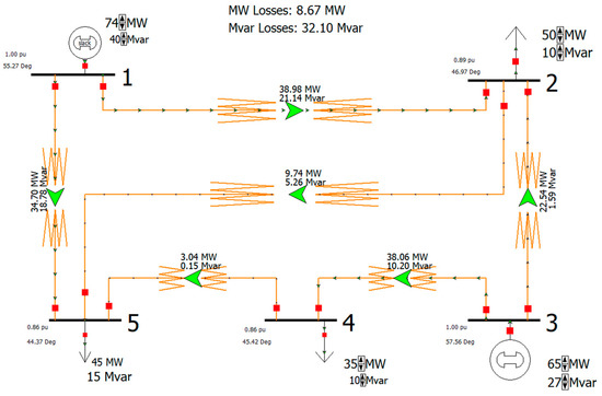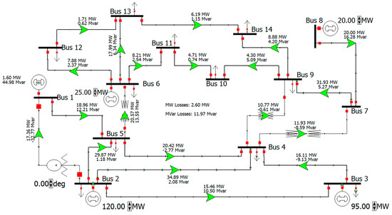 While confirming the conclusions from the previous examples, the test system was developed to include a larger number of nodes and two voltage levels. The 14-bus IEEE (14 W) test system was used. Figure 18 shows a schematic of the test system.