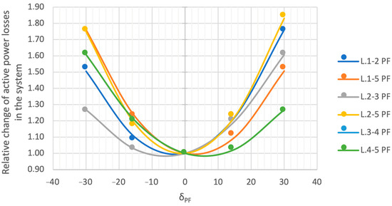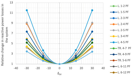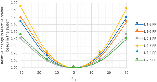 On the basis of the obtained results, the dependencies of changes in active power losses (Figure 16) and reactive power losses (Figure 17) were plotted in the system as a function of the load angle. These charts clearly show that any change in the load angle significantly increases the power losses in the system.
