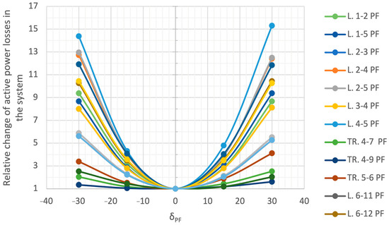 Finding the optimal operating point of the tested system is much more complicated and must take into account a number of factors influencing its changes. The system should meet the conditions of the basic N-1 criterion with the least possible impact on the increase in power losses. When the phase shifter is in a neutral position (tap 0°), natural flow takes place. Changing the shifter’s catch, which requires a change in the load angle, artificially changes the operating point of the system and removes it from the “natural” flow, introducing an increase in active and reactive power losses. The power losses in the 14 W system are shown in the Figure 19 and Figure 20.
