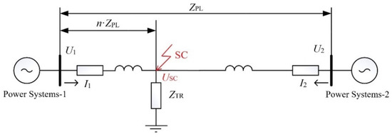 Given that the distance to the fault location (the SC point) is equal to, and equating Equations (6) and (7), after transformations, we arrive at the following expression: