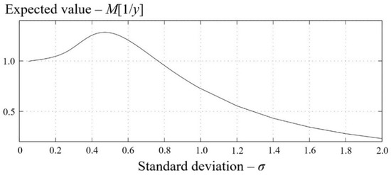 The integral of the Equation (19) is continuous and has limited integration limits, so it allows us to solve a number of practical problems of estimating the OPL FL error. In particular, given that m is normalized, we can plot the dependency of the expected value of the calculated distance to the fault location—M [1/y] as a function of the standard deviation σ of the variable y (Figure 2). The probabilistic variable y has a normal distribution with the expected value m = 1 and standard deviation, σ.