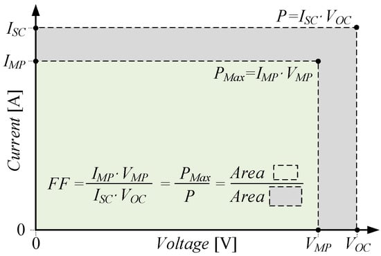 Prior to designing a diode-type PVE, the characteristics and performance of a PV panel must be understood. In general, the fill factor (FF) and diode ideality factor (a) values are outlined, to determine and compare PV panel performances [,]. First, the FF value that represents the quality of the PV panel is, in theory, the rate of the maximum achievable power of the PV panel. Figure 1 shows the grey area determined using ISC and VOC, and the green area determined using the maximum current (IMP) and maximum power voltage (VMP). Their ratios, according to (1), can be expressed as the FF. Depending on the components that constitute the cell, this rate can reach approximately 80% for silicon cells and 89% for GaAs cells. However, the FF only represents the quality according to the type of solar panel and does not reflect the latest trends of the cell diode properties that the PVE intends to imitate. Moreover, the FF is not directly related to the power diode property curve.